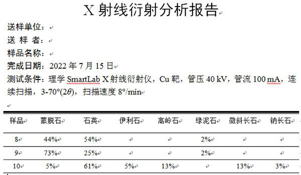 在很久以前,湖北宜昌鴉鵲嶺地區(qū)有一種土,粘度較大,吸水膨脹明顯。當?shù)厝私羞@種土為兔兒泥。最近有相關單位在該地區(qū)的田畈村周圍采集了幾組土樣送到相關檢測機構進行了詳細成分化驗。具體結果如下圖: